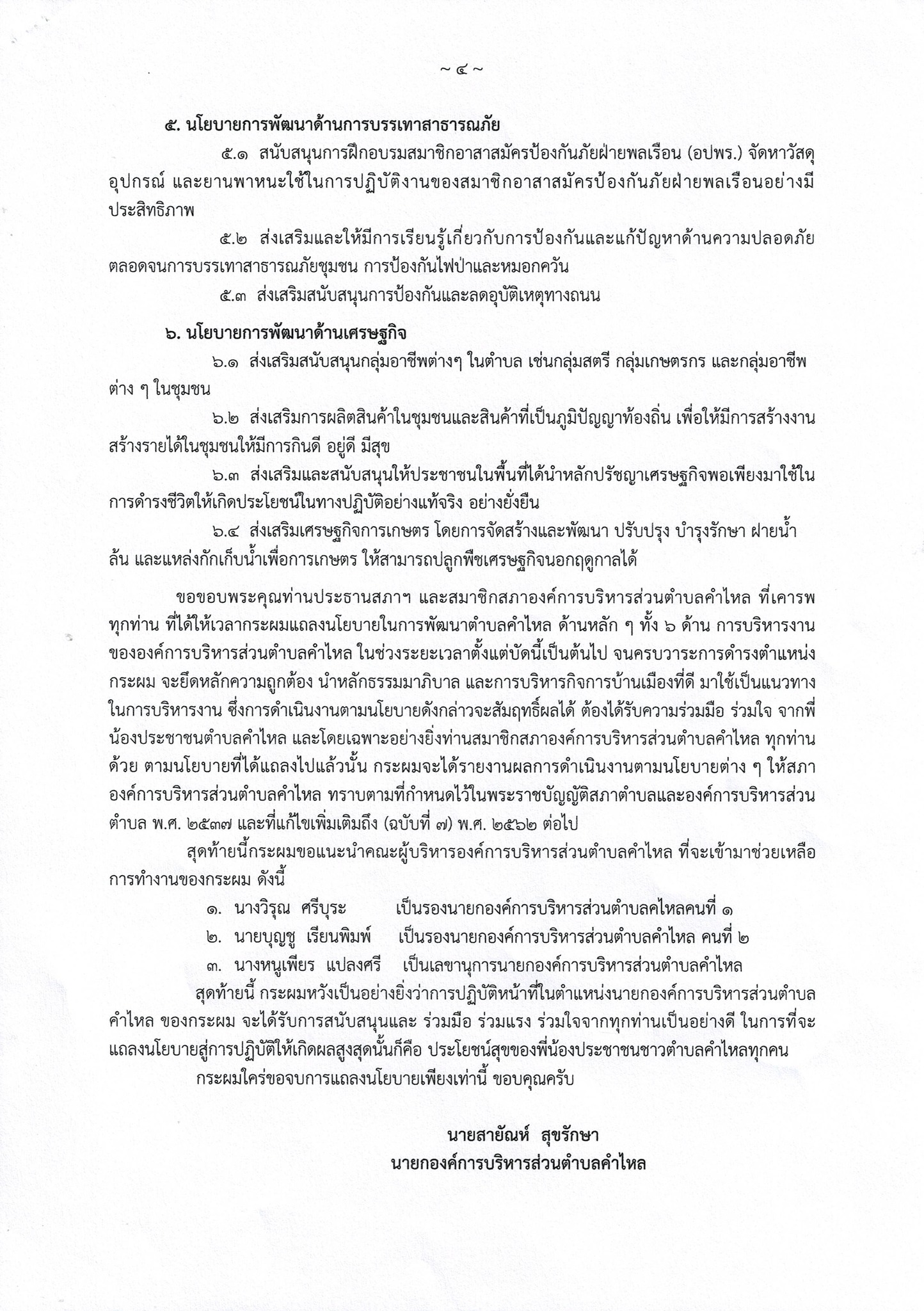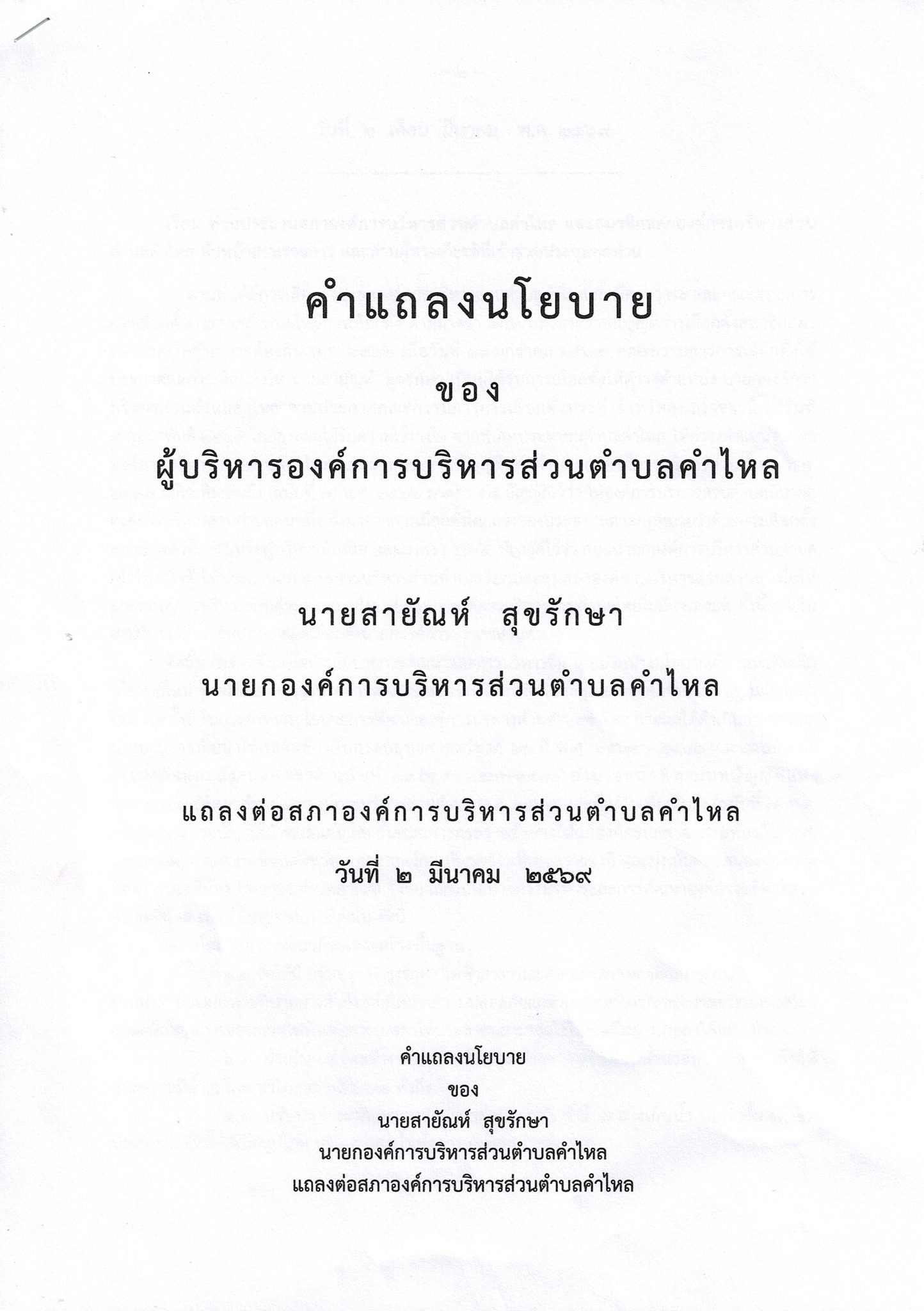 นายสายัณห์ สุขรักษา นายกองค์การบริหารส่วนตำบลคำไหล ได้แถลงนโยบายต่อสภาองค์การบริหารส่วนตำบลคำไหล