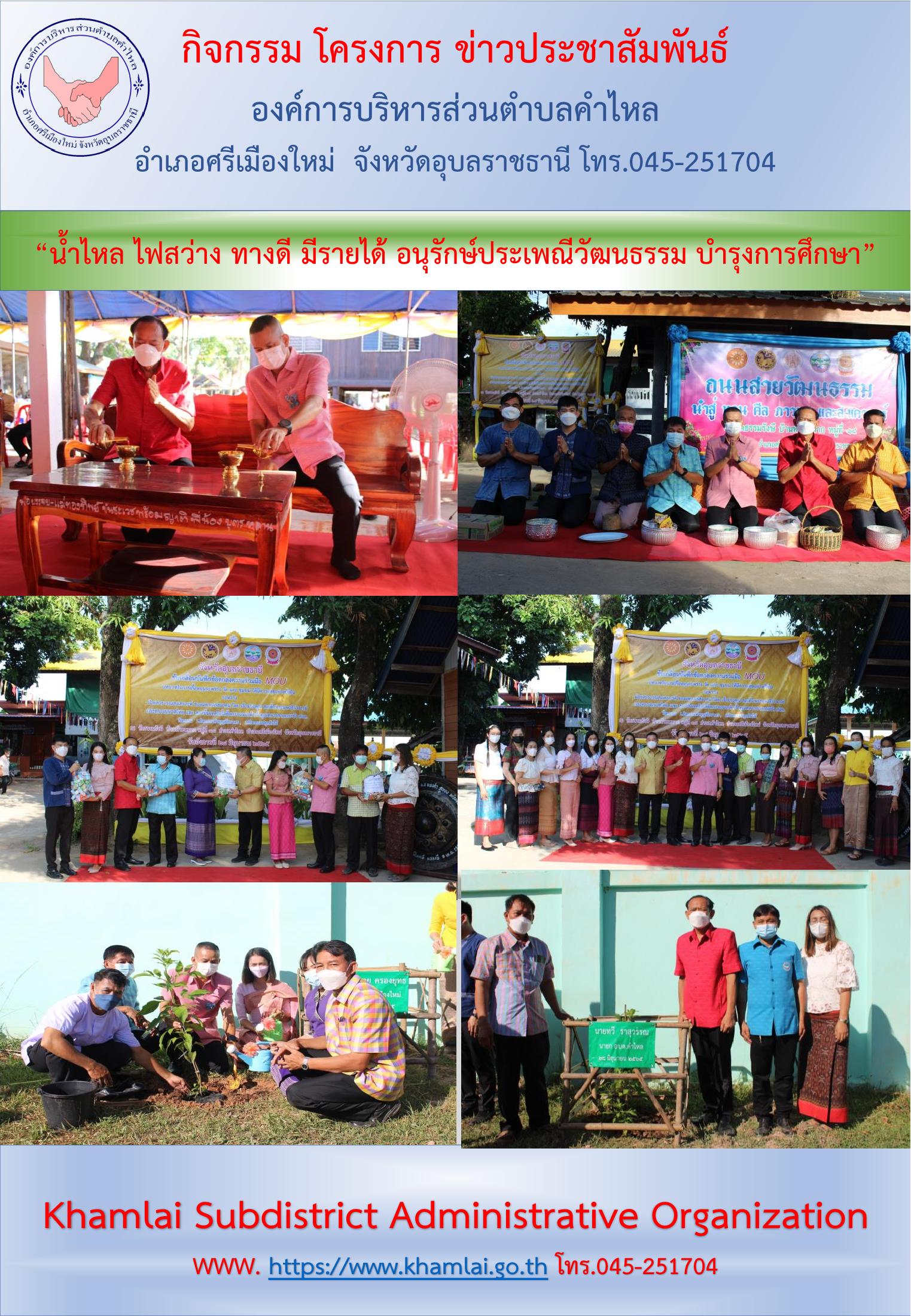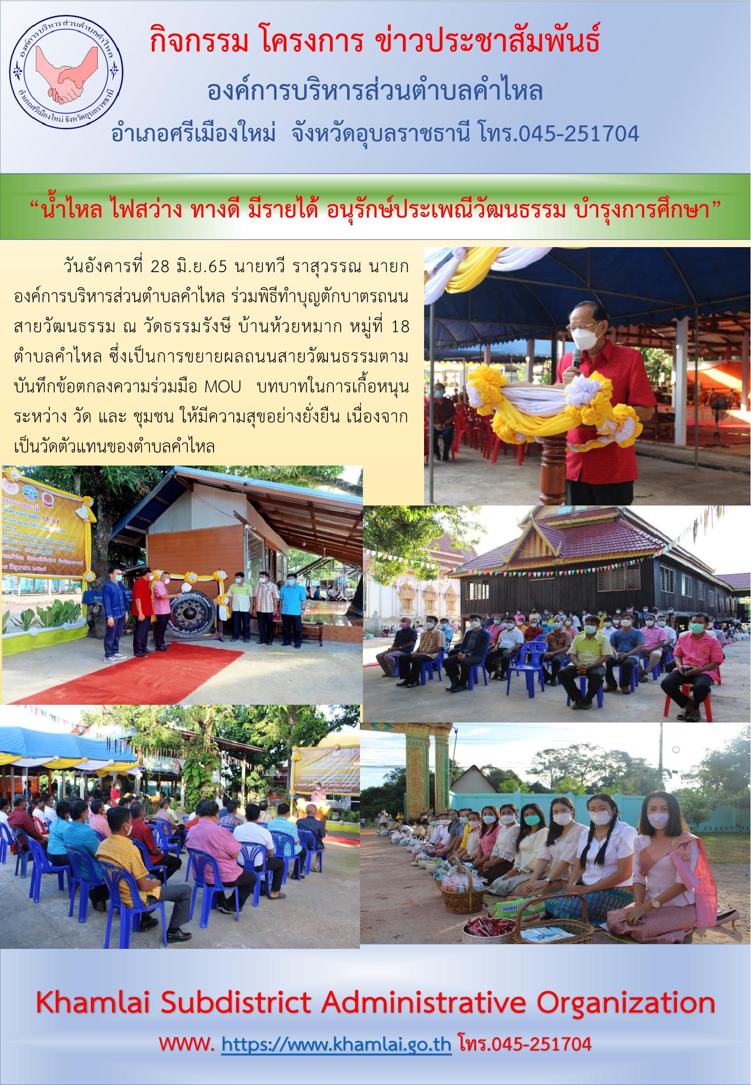 วันศุกร์, 28 มิถุนายน 3108 15:15วันอังคารที่ 28 มิ.ย.65 นายทวี ราสุวรรณ นายกองค์การบริหารส่วนตำบลคำไหล ร่วมพิธีทำบุญตักบาตรถนนสายวัฒนธรรม ณ วัดธรรมรังษี บ้านห้วยหมาก หมู่ที่ 18 ตำบลคำไหล ซึ่งเป็นการขยายผลถนนสายวัฒนธรรมตามบันทึกข้อตกลงความร่วมมือ MOU บทบาทในการเกื้อหนุนระหว่าง วัด และ ชุมชน ให้มีความสุขอย่างยั่งยืน เนื่องจากเป็นวัดตัวแทนของตำบลคำไหล ซึ่งมีการดำเนินกิจกรรมเพิ่มเติมดังนี้ 1. กิจกรรมพลังบวร ปลูกต้นไม้ เพิ่มพื้นที่สีเขียว 2. กิจกรรมพลังบวร นำข้าวก้นบาตร และสิ่งของเครื่องใช้ ให้การสงเคราะห์ ซึ่งเป็นการขับเคลื่อนการขจัดความยากจนและพัฒนาคนทุกช่วงวัยอย่างยั่งยืนตามหลักปรัชญาของเศรษฐกิจพอเพียง โดยนำอาหารจากก้นบาตรที่ได้รับเมตตาจากพระคุณเจ้า ไปแบ่งปัน ช่วยเหลือ ครัวเรือนผู้ยากจน 3. กิจกรรมมอบนมจืดก้นบาตร สนับสนุนด้านโภชนาการให้หญิงตั้งครรภ์และเด็ก ในพื้นที่ตำบลคำไหล ทั้งนี้ได้ประชาสัมพันธ์เชิญชวนให้ประชาชนสวมใส่ผ้าไทยในกิจกรรมทำบุญตักบาตร รวมทั้งการใช้ถุงผ้าหรือตระกร้าใส่ของตักบาตรแทนถุงพลาสติกเพื่อเป็นการลดขยะพลาสติกที่เป็นผลทำให้เกิดสภาวะโลกร้อน โดยนายสรชาย ครองยุทธ นายอำเภอศรีเมืองใหม่ มอบหมายให้นายเดชชาติ ทวีแก้ว ปลัดอำเภอศรีเมืองใหม่ เป็นประธานในพิธี และมีเจ้าคณะตำบลคำไหล เป็นประธานสงฆ์ และคณะสงฆ์ ร่วมกิจกรรม ในการนี้มีหัวหน้าส่วนราชการ ผู้บริหารสถานศึกษา นายก อบต.คำไหล ข้าราชการ พนักงาน ลูกจ้าง สมาชิก อส. กำนัน ผู้ใหญ่บ้าน ฯลฯ ภาคประชาชน/เอกชน และจิตอาสา เข้าร่วมกิจกรรม