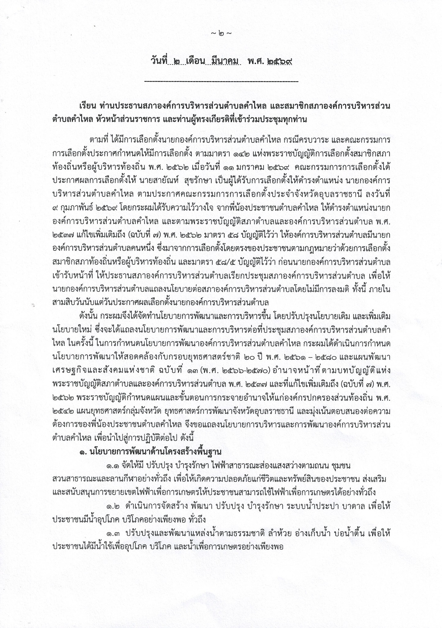 นายสายัณห์ สุขรักษา นายกองค์การบริหารส่วนตำบลคำไหล ได้แถลงนโยบายต่อสภาองค์การบริหารส่วนตำบลคำไหล